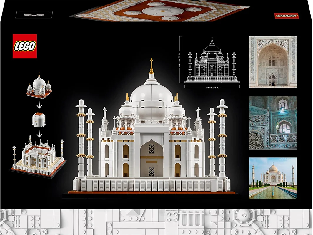 زیباترین مسجد و مقبره ممتاز و شاه جهان ساخته شده با 2022 قطعه دارای، اتاق میانی با 2 سنگ قبر، ایوان ها، گنبد اصلی، 4 آلاچیق، 4 مناره و سایر جزئیات وفادار به سبک لگو به زیبایی متحرک سازی شده اند که با حذف اتاق میانی ضریح های زیر نمایان می شود. آجر لگو با کتیبه "تاج محل" موجود در این مدل مقیاس، این شاهکار مکالمه را تکمیل می کند. چه به هند و تاج محل رفته باشید یا رویای رفتن به تاج محل را داشته باشید یا عاشق سفر و معماری باشید، این مجموعه ساختمانی برای شما مناسب است. همچنین یک هدیه بسیار خاص برای دوستان خلاق است. مدل معماری ساخته شده با این قطعات که 20 سانتی متر ارتفاع، 23 سانتی متر عرض و 23 سانتی متر عمق دارند، یک قطعه نمایشگاهی چشمگیر در خانه یا محل کار شما خواهد بود.