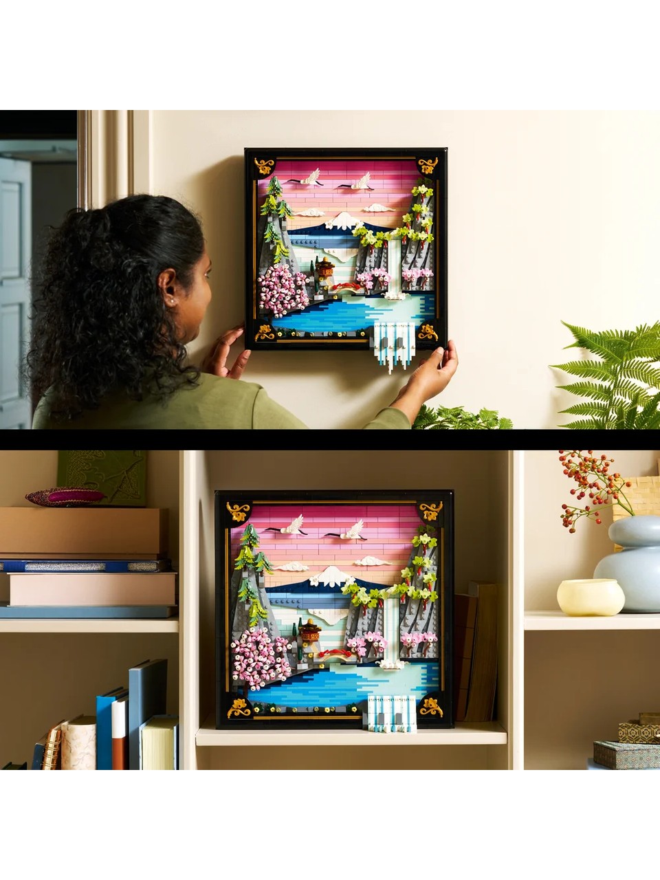 با مجموعه ماکت ساختمانسازی «منظره شکوفههای گیلاس ژاپنی» اثر لگو آرت (31218) برای بزرگسالان، طبیعت را به خانه خود بیاورید و به آن رنگ ببخشید. این اثر هنری دیواری تزئینی سهبعدی آجری که با الهام از زیبایی بهار در ژاپن و هنرمندان اوکییوئه این کشور ساخته شده است، کوه فوجی، یک چایخانه، یک پل، یک آبشار، درناهای ژاپنی در حال پرواز، شکوفههای گیلاس، یک درخت افرای «سانگو-کاکو» و کاجهای چتری ژاپنی را به تصویر میکشد. این مدل نمایشی تزئینی بسیار زیبا در یک قاب جعبهای سایهدار با لاک مشکی قرار گرفته و دو گزینه برای نمایش ارائه میدهد: میتوان آن را روی دیوار آویزان کرد یا به صورت عمودی روی یک سطح صاف قرار داد. آبشار از قاب فراتر میرود و به آن اجازه میدهد هنگام آویزان شدن از دیوار، مستقیماً به سمت بیرون سرازیر شود یا طوری تنظیم شود که روی یک سطح صاف به سمت پایین جریان یابد. این اثر هنری دیواری لگو که شامل 1892 قطعه است، به بزرگسالان تجربهای فراگیر و آگاهانه در هنگام ساخت این اثر هنری دیواری گیاهی با آجرهای لگو ارائه میدهد.