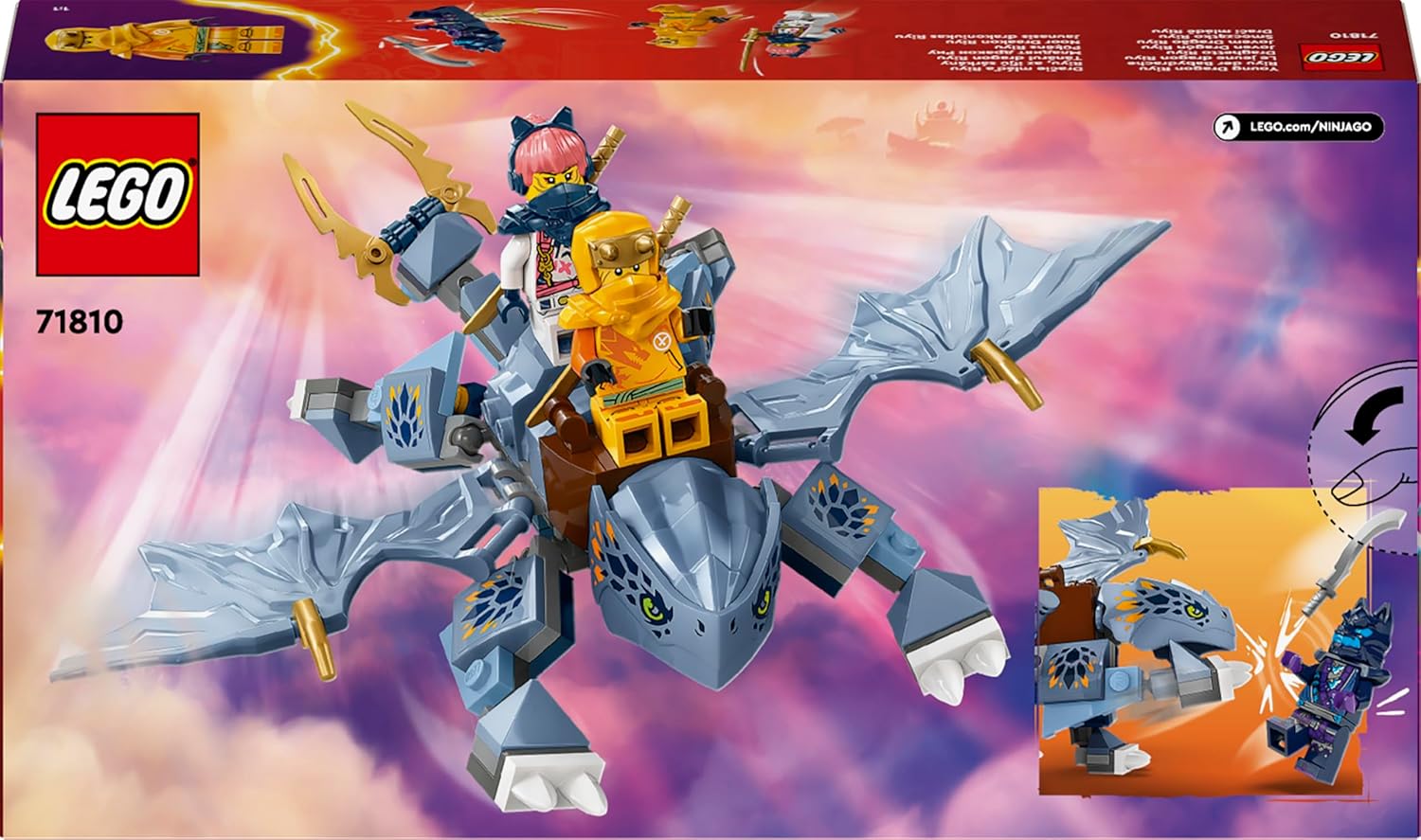 بچهها میتوانند با این اسباببازی اژدها، صحنههای اکشن فصل دوم نینجاگو: ظهور اژدهایان را بازسازی کنند.برای ماجراجوییهای نقشآفرینی، بالها، دم و پاهای ریو، اژدهای جوان، قابل تنظیم هستند.۳ مینیفیگور: سورا، آرین و جنگجوی نقابدار گرگ به همراه لوازم جانبی سلاح.ایده هدیه نینجا برای کودکان ۶ سال به بالا برای بازی مستقل.برای دستورالعملهای ساخت سهبعدی تعاملی، برنامه LEGO Builder را دانلود کنید.