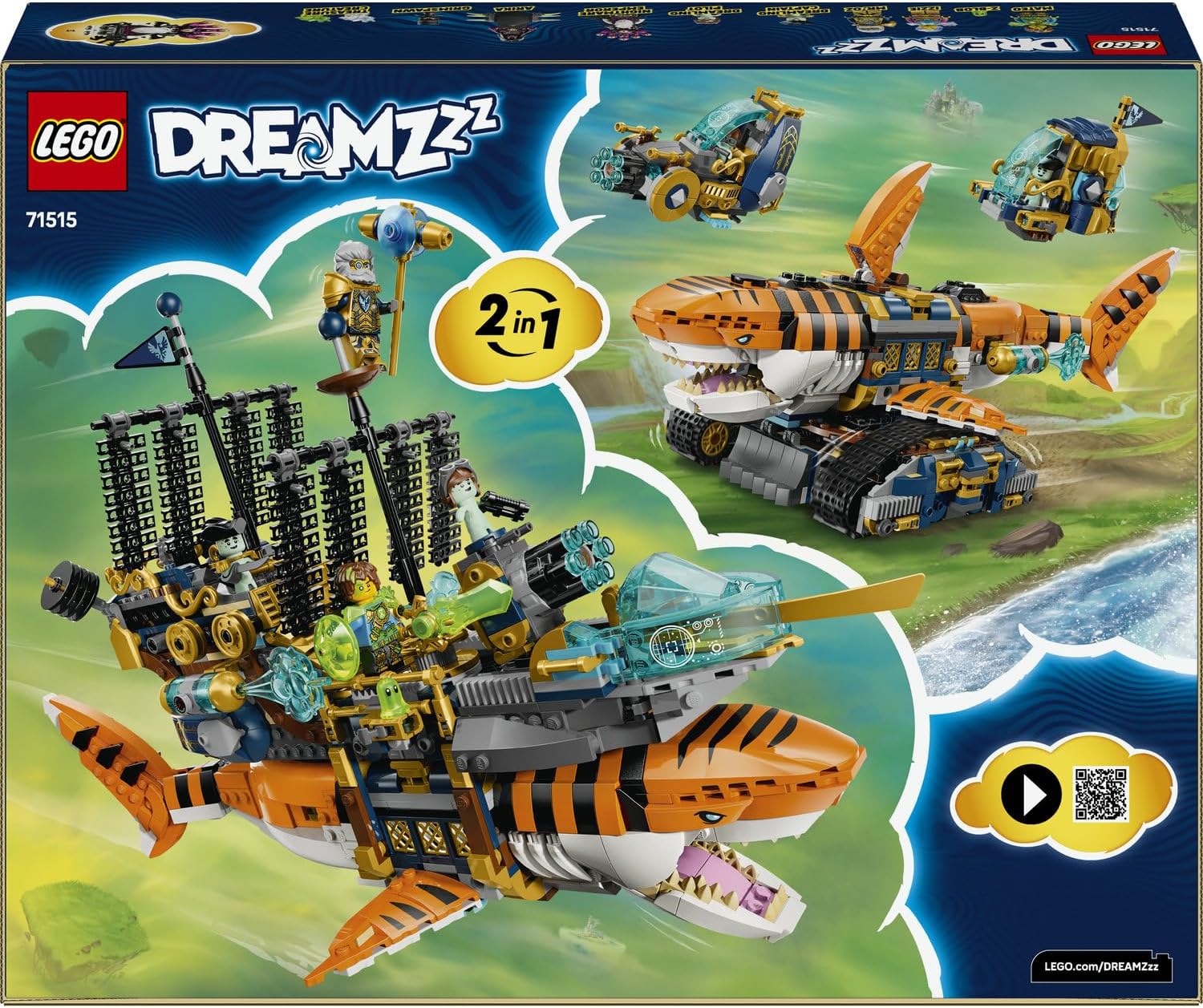 اسباببازی کوسهی تبدیلشونده - با مجموعه اسباببازی ساختنی لگو DREAMZzz Tiger Shark Tank (71515) برای پسران و دختران ۹ سال به بالا، که شامل ۲ گزینه ساختوساز است، تخیل خود را آزاد کنید.اسباببازی کوسه تانک - بچهها میتوانند یک اسباببازی کوسه تانک قابل راندن با دهانهی باز، دم متحرک و دو کپسول جانبی حاوی پرتابکنندهها، فضای ذخیرهسازی و یک مینیفیگور خلبان بسازند.اسباببازی کشتی دزدان دریایی - بچهها میتوانند اسباببازی را به یک کشتی کوسه دزدان دریایی با یک توپ جلویی، پرتابکنندههای جانبی، دهانهی باز، صندوقچهی گنج در عقب و لوازم جانبی لنگر تبدیل کنند.۵ مینیفیگور - شامل مینیفیگورهای Mateo، Izzie، Mr. Oz، Nightmare Emperor و Arika برای پشتیبانی از بازیهای نقشآفرینی، به علاوهی Z-Blob، Grimspawn، ۳ عنکبوت، ۲ موجود رویایی و ۲ فیگور موجود گنج. هدیه اسباببازی فوقالعاده - این مجموعه اسباببازی کوسه اسباببازی پر از جزئیات است و یک ایده هدیه سرگرمکننده برای طرفداران LEGO DREAMZzz 9 سال به بالا است، مناسب برای تولد، کریسمس یا هر زمان دیگری.