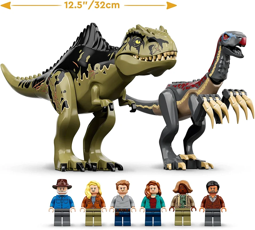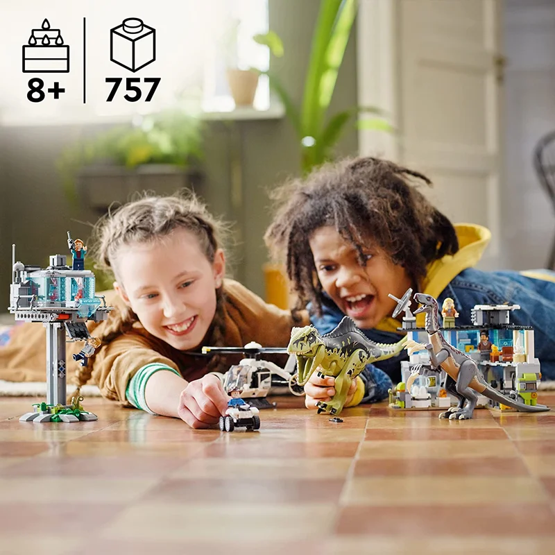 6 مینی فیگور - اوون گریدی، کلر دیرینگ، دکتر. آلن گرانت، دکتر. الی ساتلر، کایلا واتس و دکتر. هنری وو، همچنین یک Giganotosaurus متحرک به طول 32 سانتی متر و یک Therizinosaurus HQ قابل ساخت، هلیکوپتر اسباببازی و وسیله نقلیه تمام زمینی – HQ دارای یک آزمایشگاه مملو از لوازم جانبی الهامبخش بازی، یک گاراژ، یک اتاق کنترل دقیق و یک برج مشاهده با سکوی تخریب شده است. اسباببازی هدیه برای سنین 9 سال به بالا - این مجموعه ممتاز هدیهای سرگرمکننده برای تولد برای بچههای دایناسور دوست است . ساخت و مونتاژ - ارتفاع آزمایشگاه 16 سانتی متر، عرض 21 سانتی متر و عمق 16 سانتی متر است. کل مجموعه با سایر مجموعه های دنیای ژوراسیک لگو برای امکان بازی بیشتر سازگار است.