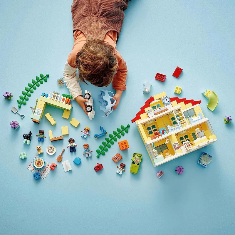 خانه عروسک آموزشی – با اسباب بازی آموزشی LEGO DUPLO Town 3-in-1 Family House (10994) برای سرگرمی بی پایان در بازسازی، رشد خلاق، اجتماعی و عاطفی کودکان را تشویق کنید.همه خوش آمدید - این مجموعه شامل 7 فیگور، از جمله مادر، پدر و 3 بچه، به علاوه یک گربه و سگ اسباب بازی است که طیف واقعاً متنوعی از امکانات بازی را ارائه می دهد.بازی در دنیای واقعی – نقش آفرینی کودکان پیش دبستانی در زندگی خانوادگی، از روتین های قبل از خواب گرفته تا آماده کردن وعده های غذایی سالم در آشپزخانه، پرورش سبزیجات، یا شارژ کردن ماشین اسباب بازی «برقی فشاری» در گاراژ.هدیه برای کودکان بالای 3 سال – با گزینههای بازسازی خلاقانه، لوازم جانبی و اتاقهای زیبا برای کاوش، این خانه عروسکی یک هدیه خاص و دوستداشتنی برای کودکان نوپا که عاشق خانه بازی هستند، میسازد.ابعاد – مدل اصلی 36 سانتی متر، عرض 35 سانتی متر و عمق 21 سانتی متر است. ماشین Push and Drop 8 سانتی متر ارتفاع، 14 سانتی متر طول و 7 سانتی متر عرض دارد