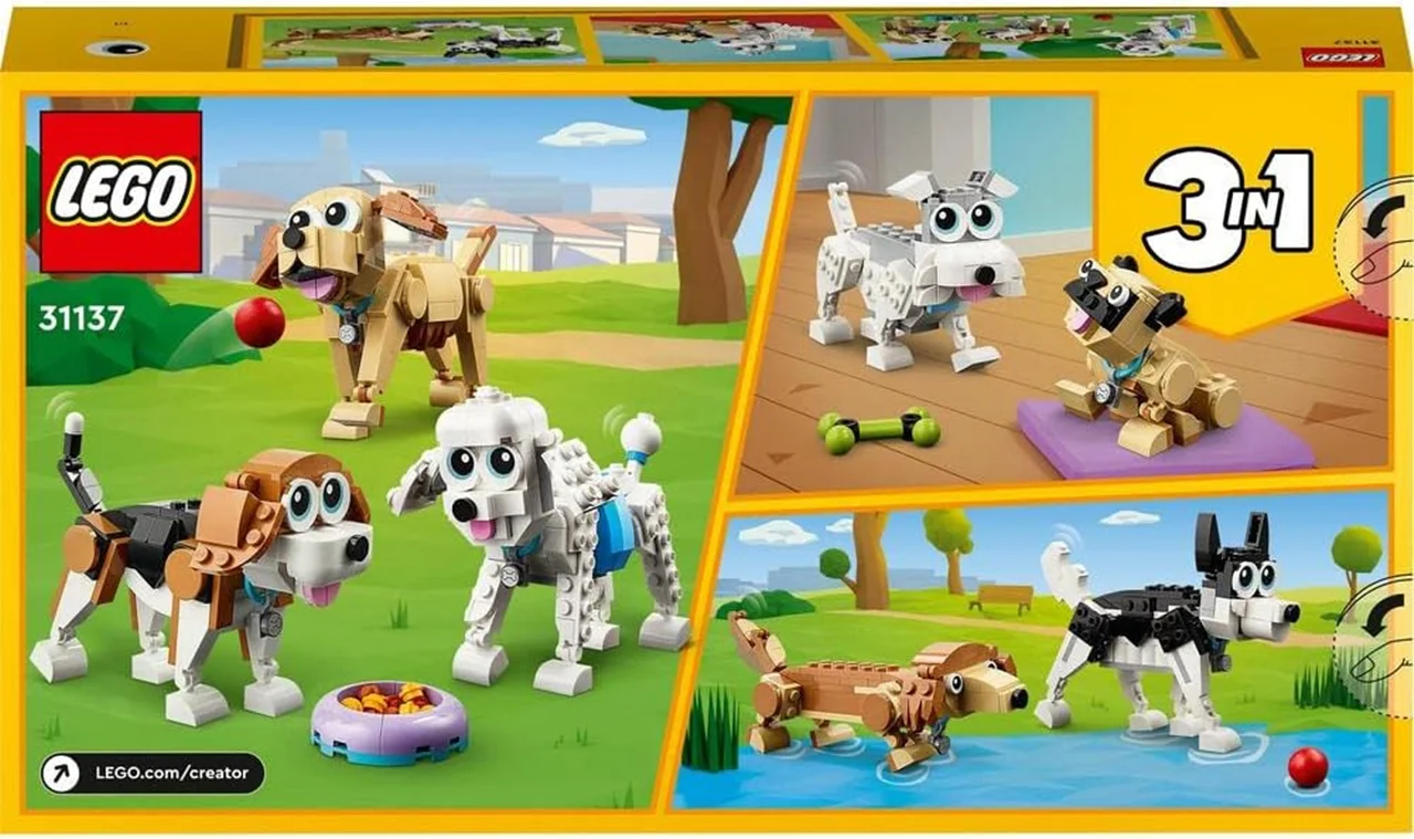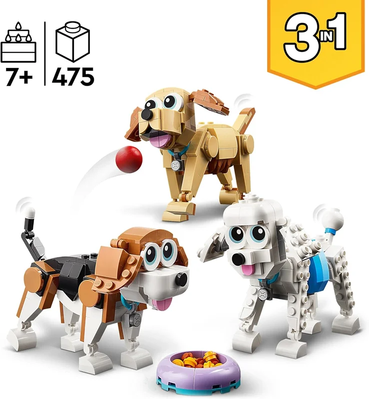 مجموعه ساختمانی 3 در 1 - کودکان می توانند 3 گروه مختلف از سگ ها را با این مجموعه بازی LEGO Creator 3-in-1 Dogs (31137) ایجاد کنند.اسباب بازی های مختلف سگ - دوستداران سگ می توانند 3 گروه مختلف سگ بسازند و با آنها بازی کنند: بیگل، پودل و لابرادور. یک شناوزر و پاگ مینیاتوری یا یک داشوند هاسکی و مو بلنداسباب بازی های متحرک - هر سه سگ دارای سر، دم و گوش متحرک و پاها و پنجه های تاشو برای نشستن یا کشش هستند.لوازم جانبی سرگرم کننده - هر 3 گروه سگ دارای لوازم جانبی مانند کاسه غذا، استخوان لاستیکی، توپ، برس، اسباب بازی خرگوش و بند سگ هستند.ساخت ساده - این مجموعه اسباب بازی سگ 475 قطعه ای سرگرمی ساختمانی و بازی را برای کودکان بالای 7 سال ارائه می دهد و یک ایده هدیه برای هر مناسبتی برای دوستداران سگ های سرسخت است.