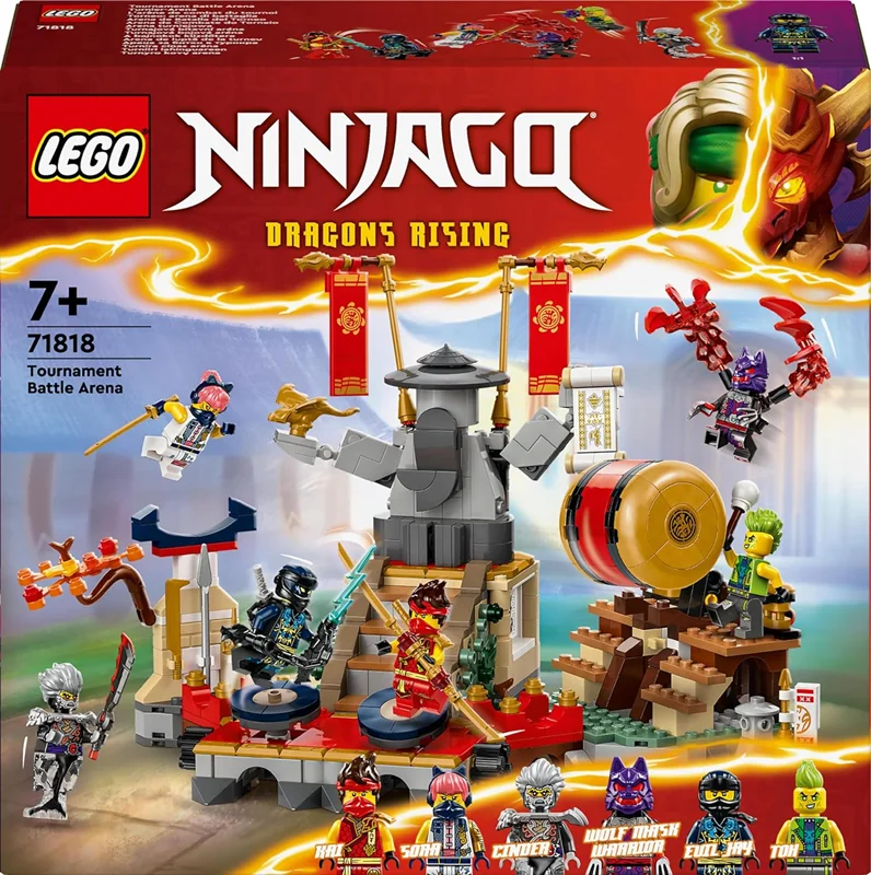 مجموعه بازی نبرد NINJAGO برای کودکان پسران و دختران هفت ساله به بالا می توانند صحنه های اکشن باورنکردنی از فصل دوم سریال تلویزیونی NINJAGO Rise of the Dragons را با مجموعه مسابقات Tournament Battle Arena بازسازی کنند.اسباب بازی نقش آفرینی تعاملی، اسباب بازی اکشن Arena دارای دو سکوی متحرک است که در آن بچه ها می توانند یک نینجا و یک شرور را قرار دهند تا نبردهای اکشن را روی صحنه ببرند.بشکه چرخان و پلکان در حال فروریختن بچه ها می توانند اهرم را بکشند تا پله های سالن را فرو بریزند و یک مینی فیگور را به پایین بفرستند، یا بشکه را از پایه خود فشار داده و به داخل سالن بغلتند.شش مینی فیگور NINJAGO، این اسباببازی نینجا برای بچهها شامل نینجاهای Kai و Sora در زره مسابقات خود میشود که در برابر سیندر، جنگجوی نقابدار گرگ و ایول جی و توکس انحصاری مبارزه میکنند.