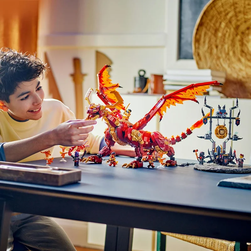 اسباب بازی ماجراجویی اژدها برای کودکان، پسران و دختران بالای 12 سال می تواند اکشن هوایی فصل دوم سریال تلویزیونی NINJAGO Rise of the Dragons را با Motion Source Dragon بازسازی کند.اسباببازی اژدهای نینجاگو، برای ماجراجوییهای نقشآفرینی، بزرگترین اژدهای نینجاگو دارای پاها، دم، باسن، فک، سر، گردن و بالها است.تخت زین اژدها دارای یک تخت زینی بزرگ در پشت خود است که بچه ها می توانند یک مینی فیگور را برای پخش داستان در آسمان قرار دهند.شش مینی فیگور NINJAGO، مجموعه بازی نینجا شامل جنگجویان نینجا Kai، Wyldfyre و Arin، همه با لوازم جانبی سلاح، به علاوه شرورهای Lord Ras، Jordana و Wolf Mask Warrior است.