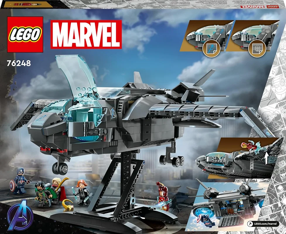 سفینه فضایی دقیق – LEGO Marvel Avengers Quinjeti (76248) اقتباسی واقع گرایانه از هواپیمای سوپر قهرمان از فیلم های مارول است.شخصیت های معروف – شامل 5 مینی فیگور نمادین: بیوه سیاه، ثور با چکش، مرد آهنی، کاپیتان آمریکا با سپر و لوکی با چوب دستی اش.ساخت، بازی و نمایش – این بازسازی دقیق از هواپیمای معروف Quinjet دارای یک کابین باز، قسمت سرنشینان و محفظه عقب، و همچنین ارابه فرود جمع شونده و بال های قابل تنظیم است.هدیه ای برای طرفداران مارول – این Quinjet قابل ساخت یک تولد هیجان انگیز، کریسمس یا هدیه ای برای کودکان 9 ساله به بالا می سازد.ماجراجوییهای هواپیمای حماسی – با چرخهای کشیده و بالهای جمع شده، ابعاد کوینجت بیش از ۵ اینچ (۱۴ سانتیمتر) ارتفاع، ۱۳ اینچ (۳۴ سانتیمتر) طول و ۱۴ اینچ (۳۵ سانتیمتر) عرض است.